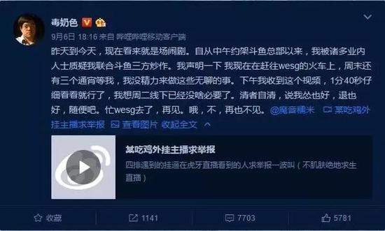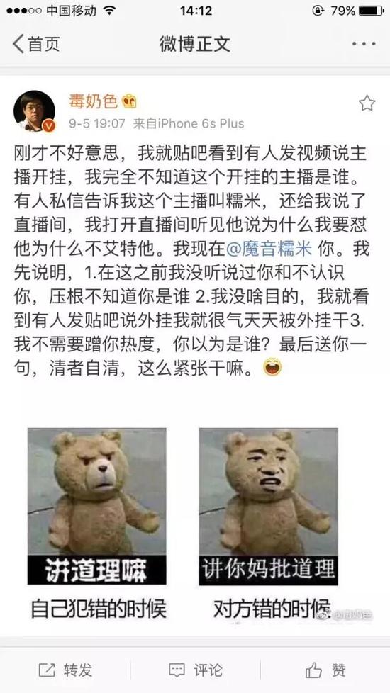 就是这条微博,引发了这场惊动了整个电竞圈的“撕逼大战”“之后过了大概两三个小时,很多人微博私信我说糯米在直播里面怼我,还把房间号给我,我就点进去看了。结果看到他在直播里说什么你们大V蹭我热度,你们这些大V每个人都说我开挂,就是没人敢@我说我开挂。”说到这里色总邪魅一笑(脑补即可),“我这个人其实脾气比较刚的,听到他这么说我就不开心了,我就直接艾特他了。”