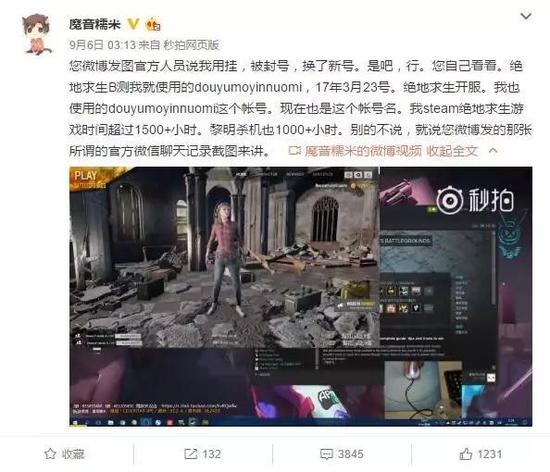 “事情的起因是这样的,之前我在玩游戏(《绝地求生:大逃杀》),被外挂打死了,这个时候其实还是有点不爽的。之后逛贴吧的时候看到这么一篇贴子,说主播开挂,我点进去看里边的分析,说这个叫糯米的开挂,还是大主播怎么怎么样,我当时的反应就是‘哦,吃鸡大主播还开挂’,就转到了我的微博,喷了几句。其实我的本意是让《绝地求生》官方净化一下游戏环境,不要让外挂那么猖獗——就结束了,我连糯米是谁都不知道,我也没有指名道姓说他。”