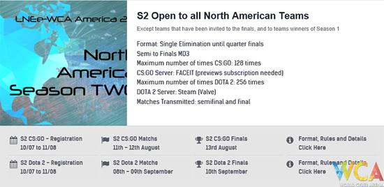 WCA美洲赛区北美S2赛季美洲赛区就《CS:GO》与《DOTA2》两项赛事报名战队达200余支,其中不乏该赛区知名战队,《DOTA2》赛事项目7月10日-8月10日报名启动,9月8日-9月9日两天北美区《DOTA 2》报名战队迎来精彩较量,而在9月10日迎来该赛事项目决赛。
