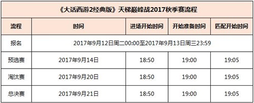 导语:高手过招,一决高下!《大话西游2经典版》天梯巅峰战2017秋季赛震撼来袭,一场高手云集的顶端赛事,一个万众关注的荣耀舞台即将开启!报名将于9月12日至9月13日期间火热开启,在这里,有强劲的对手,酣畅的战斗等你参战,更有冠军荣耀以及限时特殊称谓奖励、雕像奖励等丰厚奖励等你赢取!
