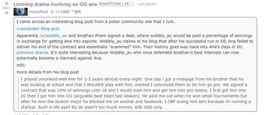 附上Blog原文:(tian、Wobbly)在ana出道前,我曾与他彻夜开黑游戏,持续了将近一两年。当时他还只是个学生,长时间游戏未免会影响到学业成绩,因此其家人联系了我,建议我不要再拉着ana打游戏。不过借此机会,我努力说服他们去转变思路,不如让ana走上职业玩家的道路吧。通过我牵线搭桥,ana先后加入IG、OG。成为职业选手之后,起初,ana参与赢下的都是中小型比赛,他也履行了自己的承诺,将所得奖金10%作为酬劳支付给我,但是在赢下波士顿Major大奖之后,他却拉黑了我。顺带声明一下,我并未将ana小兄弟当成ATM取款机,这10%是我的辛劳应有所得。他欠我这6W美元,对我来说并不多,但这友谊的小船说翻就翻,令人感到十分XX。”