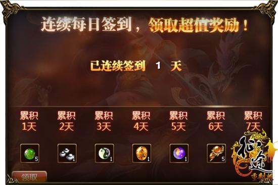 玩家进入游戏,只要每天连续登陆游戏,持续7天,就可每天领取一次奖励,总共有修炼经验丹*5、银子5锭、太极珠(初级)、属性石*1、太极珠(高级)、无暇升级宝石*5、金子(绑定)*10两。