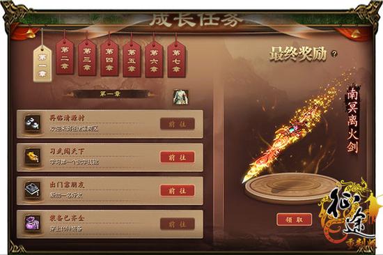 玩家进入游戏后,可以在成长任务界面内领取全新历练任务。分为七章的成长任务将帮助玩家完成从新手到高手的完美蜕变。每完成一章任务就能获得一份珍稀道具奖励。如果完成全部七章成长任务,还能领取终极大奖——永久“南冥离火剑”飞行坐骑。