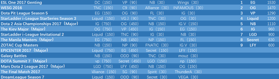 如果上面的一大串数字让你看的一头雾水——别慌,现在就让我们类比一下17年上半年的情况,用新的积分规则,去推导出一份TI7的邀请名单。