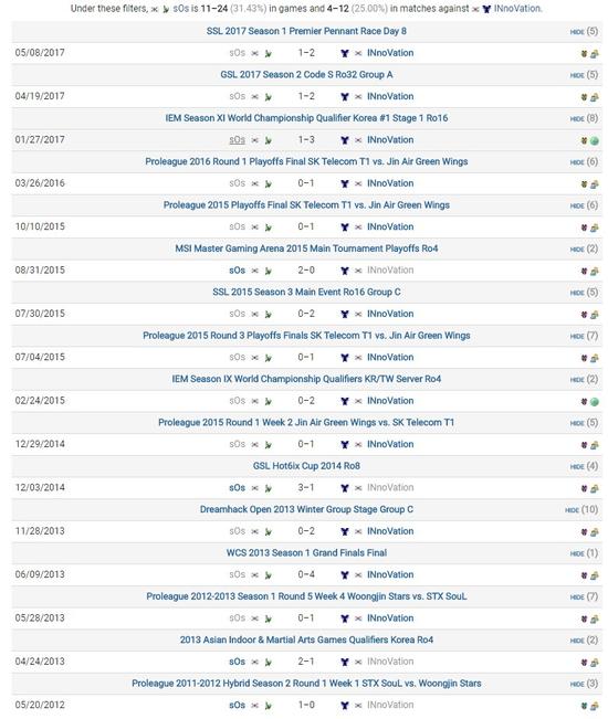 虽然很多人期待狗哥重获新生,但从历史交手记录情况来看,INnoVation的胜面还是非常大的。sOs与INnoVation在历史上共交手过16次,INnoVation以大比分12胜4负、小比分24胜11负的成绩占据绝对优势,且狗哥自2015年8月份的MSI大师赛2-0战胜INnoVation后再未战胜过INnoVation。即使在狗哥的最鼎盛时期面对INnoVation也难求一胜,INnoVation堪称狗哥的绝对克星。不过从近期的表现来看,INnoVation并不在其最佳状态,上一次卫星哥打GSL决赛还是在五年前,以sOs的战术执行力和大局观也并不是毫无机会。