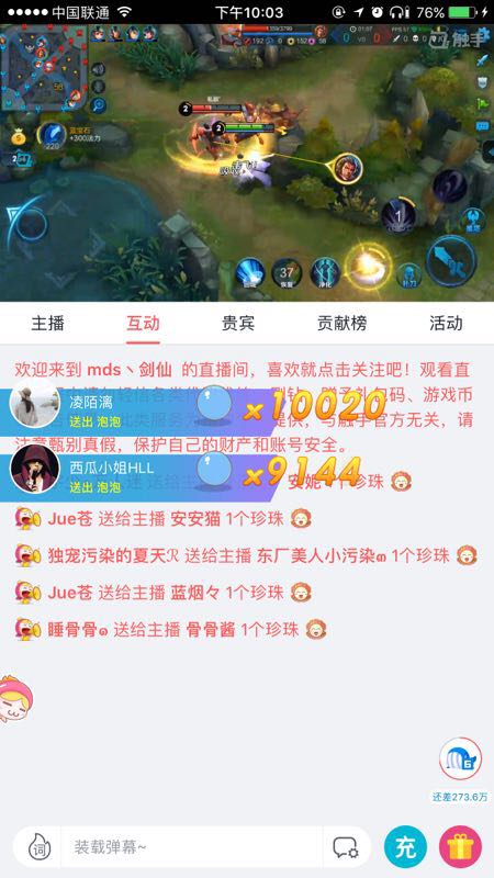 今天的直播更是吸引了五位真爱粉狂点礼物长达2个多小时之久,送出5个1万泡泡连击。此处需要划重点的是,触手直播的泡泡只能1个1个送,这五位小迷妹绝对是杠上了,在这里心疼5个小迷妹的鼠标/手机屏幕3秒。以1秒2下的点击速度算,这五位小迷妹加起来一直点击的时间已经超2个多小时,吃瓜群众皆表示“绝对是真爱”!