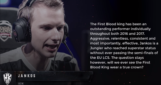 一血帝是一个在2016和2017赛季中个人表演很出彩的选手。他很有进攻性,心狠,敢于坚持,最重要的是,很有效率。Jankos是一个没有进入LCS半决赛就去过superstar舞台的打野。那么问题来了,什么时候我们可以看见一血帝拿到一个属于他的皇冠呢?