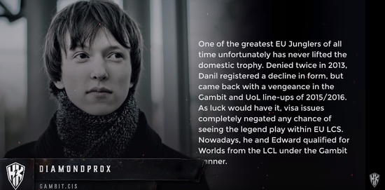 他是欧洲LCS最好的打野之一,但他却从来没有拿过任何一个冠军。2013年的连续两次失利让Danil选择了短暂的休整。他之后分别在2015和2016赛季代表Gambit和独角兽出战,然而由于签证原因(欧洲不提供工作签证给俄罗斯人),Danil和Edward转战LCL并于今年重新进入到世界赛的舞台。