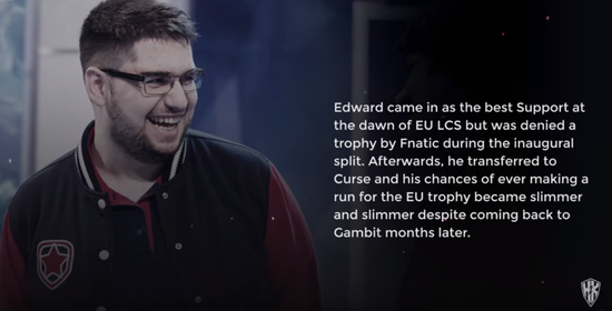 Edward是欧洲刚起步时最出色的辅助,然而在首届系列赛中,他所在的队伍输给了Fnatic。 之后他转会到了Curse,也使他获得冠军的几率越来越小。而在数月之后,他到了Gambit, 拥有了争夺冠军的实力。