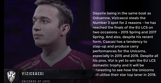 和Odoamne一样,Vizicsacsi 一直有一个稳定的成绩,而把他放在第三位是因为他曾在2015的春季和2017的春季进入过LCS的决赛中。同时,Csacasi有着能让独角兽前进一步的趋势,尤其是在2015和2016赛季。Vizi将向自己的LCS冠军进军,而我们可以更加期待在2018年的时候,独角兽将怎么正确利用自己的明星上单。