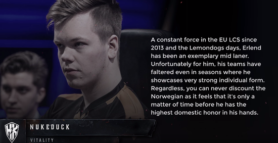 在EU LCS的比赛结束后,H2K官方发布了自己认为的十位未获得冠军的EU LCS优秀队员。