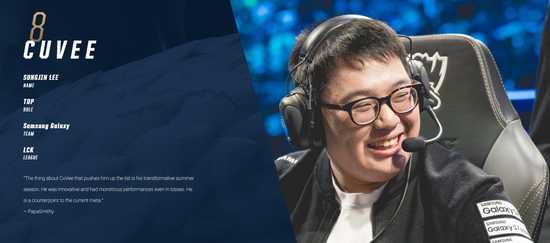 CuVee在这个榜单,主要是因为夏季赛他的风格非常多变。他善于创新,即便是输掉的比赛,他的表现依然非常亮眼。他是逆版本的一个存在。