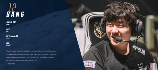 Bang是英雄联盟的王者,但即便是站在顶峰的选手,依然会看起来非常脆弱。Bang一直是出类拔萃的大赛型选手,但在夏季赛他也迷茫过一段时间。如果你胆子够大,就不要期待Bang在世界赛的末尾回到他的巅峰。