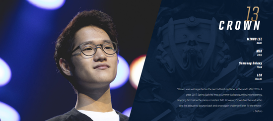 S6世界赛后,Crown被认为是世界上第二好的中单选手。2017LCK春季赛,Crown表现非常出色,但在夏季赛,他的不稳定使他排在更为稳定的Bdd后。不过,Crown的勤奋和态度会让他恢复状态,并再次挑战Faker的王位。