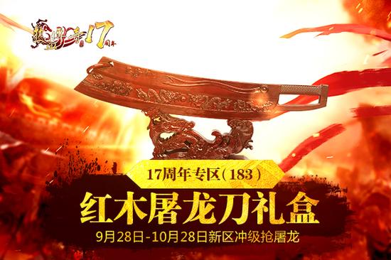 《热血传奇》17周年庆,新区活动狂欢不停!作为传奇周边中最有价值和代表至尊地位的顶级藏品,限量版的精美红木屠龙刀也将现身新区冲级活动!只需入驻17周年专区(183区),在指定的活动时间内,冲级进入排行榜前十名,同时等级达到60级的玩家,即可把顶级藏品抗回家!
