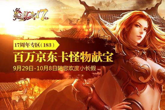 《热血传奇》17周年专区(183区)以最直接的方式回馈大家,百万京东卡怪物献宝,连爆10天!通过怪物攻城的方式为传奇玩家送福利,简单、粗暴、直接、刺激!陪伴全国玩家欢度国庆、中秋黄金小长假!所有爆落的京东卡都是50元面值的!人人可爆,机会均等!