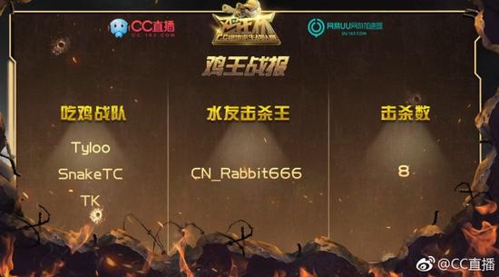 CC直播《鸡王杯》第二场天气晴天,航线处于中间,全图各个地方都能去,FTD战队落地成盒被QST战队灭队,LGD战队zhouke被队友用车撞死(未被补),VG队伍在灭了多个队伍之后,由于跑毒不及时被EDG卡毒边打死;水友CN_rabbit“水鬼战术”相当成功,偷到8个人头;SnakeTC战队灭掉OMG之后与wNv相逢决赛圈,最后SnakeTC队吃鸡成功,拿下13个人头。