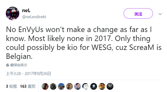 不过如今爆料大神neL表示EnVyUs不会做出阵容调整。唯一有可能的变化是为了参加WESG而暂时招入kioShiMa,因为队内的爆头哥ScreaM是比利时人。