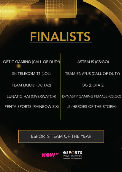 该奖项去年由EnVyUs战队获得,今年EnVyUs依旧有提名。小编认为该奖项比较有竞争力的战队有Liquid(DOTA2 TI7冠军)、Astralis(CS:GO Major冠军)以及SKT(LOL季中赛冠军)。目前奖项正在投票统计中。