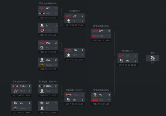 此次VG战队的晋级之路也可以说是艰险万分。在预选赛第一轮,VG战队状态低迷,直接以0-2的比分不敌LGD战队,掉入了败者组。但他们成功调整好了队伍的状态,在败者组比赛中顽强的杀了上来。VG战队一路力克Bheart,iG,EHOME战队,并在败者组决赛中成功2-0复仇LGD,杀入总决赛,最终气势如虹的VG击败胜者组冠军LFY战队,获得这一宝贵的出线名额。