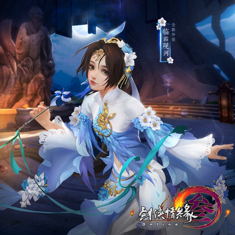 “寒江翦云”,采用了更加传统的风格设计理念,整套外装利落修身,领口和衣袖均有诸多细节设计,造型与众不同。手套与靴子的经典搭配也更加利于侠士行走江湖。同时,经典的“青花瓷”元素作为纹理装饰也让整套外观在造型表现上完全不逊色于其他盛装。