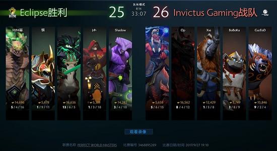 从公开赛中杀出重围的Eclipse在揭幕战中遭遇iG.V,在不被看好的情况下连下两局。首局比赛,Eclipse使用了影魔和发条技师的组合,让影魔在前期顺利打出优势,随着发条技师开始带动节奏,萨尔频频使用恶念瞥视留下iG.V的英雄完成击杀,双方差距也是越来越大。随着Eclipse推上高地,iG.V无力抵抗,只能打出GG,Eclipse先下一城。