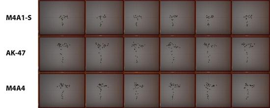 在完全不控枪的情况下,M4A4的子弹散布呈一个镰刀(T)型分布。我们再来看看M4A1-S、M4A4与AK-47的子弹散布对比。