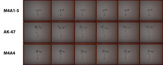 我们可以发现,子弹散布并不是完全相同的,而是在大致范围内随机落点,散布的大小按照M4A1-S<M4A4<AK-47的顺序排列。这也符合M4A4定位:中近距离扫射强火力——威力中等、射速快、散布中等、移速快、子弹多;