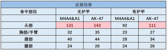 如上图可见,AK-47在敌方有头盔的情况下仍可以做到一枪毙命,但M4则不行。这就会造成CT与T双方遭遇时,各射击了对方头部一枪,CT阵亡,而T还侥幸留有一丝血而存活下来。并且双方在中近距离交火时,AK-47三枪即可击杀敌方,而M4则需要四枪。这也是天梯与职业赛场上,CT总是喜欢丢掉自己的M4,转而拾取T方的AK-47使用的最大原因。