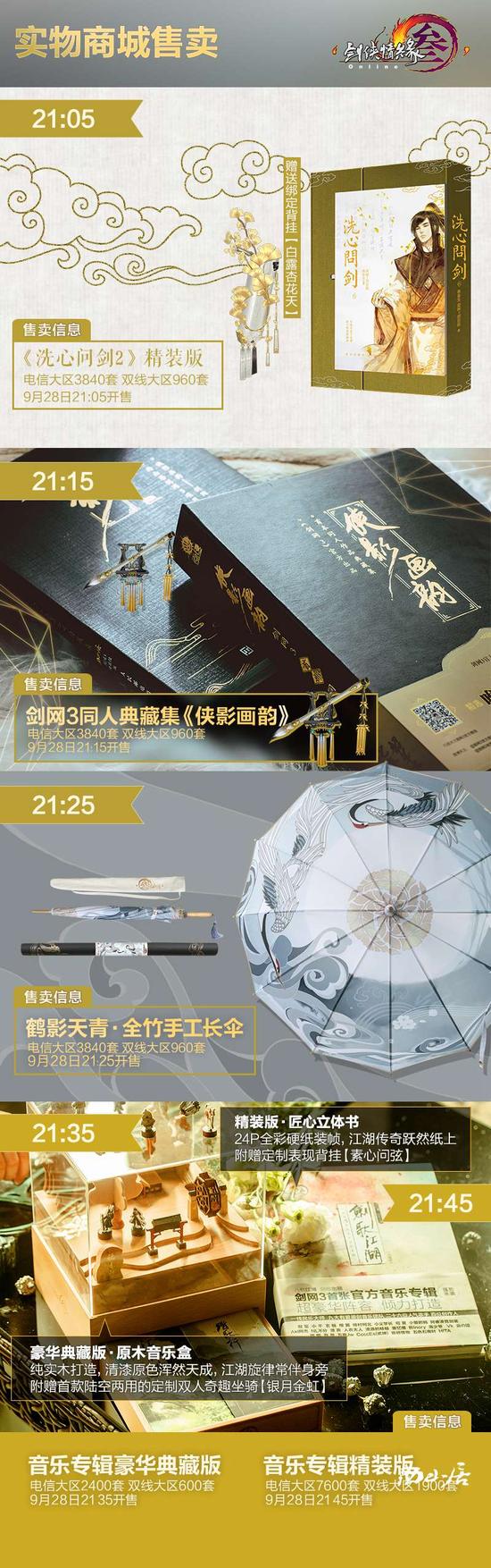 全新官方系列小说《洗心问剑》第二卷精装版今晚21:05上架游戏内商城实体周边专区,随书附赠精美挂件“白露杏花天”!同时,令众多侠士心水已久的一大波精品周边“官方同人典藏集《侠影画韵》”“官方音乐专辑《剑歌江湖》”精装版、豪华典藏版以及“鹤影天青·全竹手工长伞”也将于今晚纷纷补仓上货,喜欢的侠士万勿错过此收藏良机!