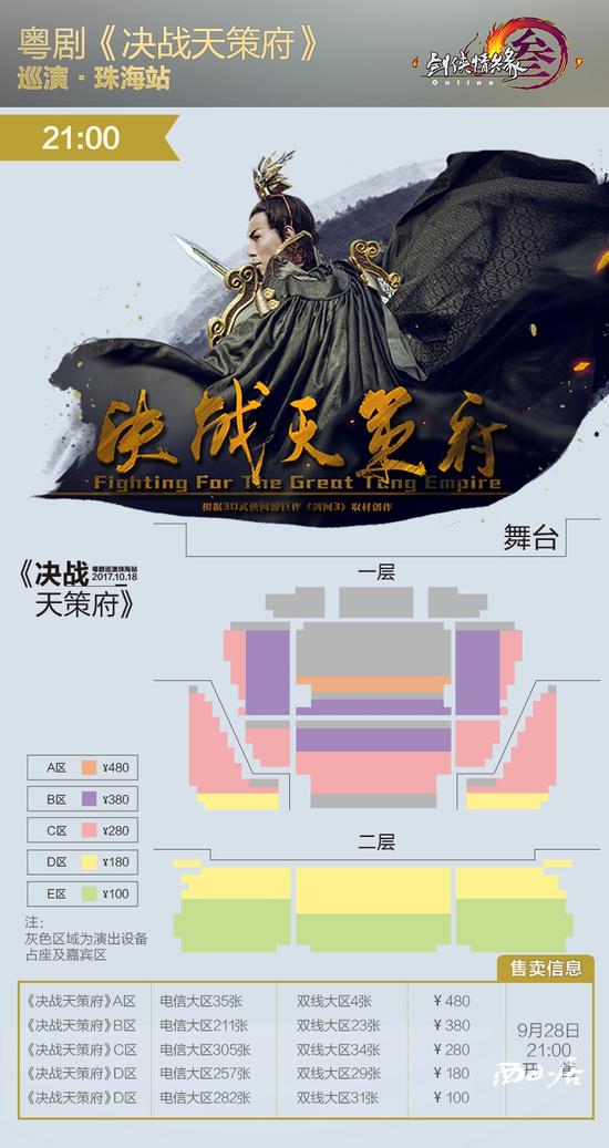 《剑网3》主题粤剧《决战天策府》巡演·珠海站将于10月18日20:00在珠海大剧院盛大开演!演出门票将于今晚21:00在游戏内商城实体周边专区上架售卖,门票按座位所处区域分为五等,同时开放售卖。侠士购买成功后可使用道具打开网站填写身份证信息,于10月18日当天凭登记的身份证原件在珠海大剧院兑换门票并现场领取粤剧定制主题背挂[劫海龙旗]。