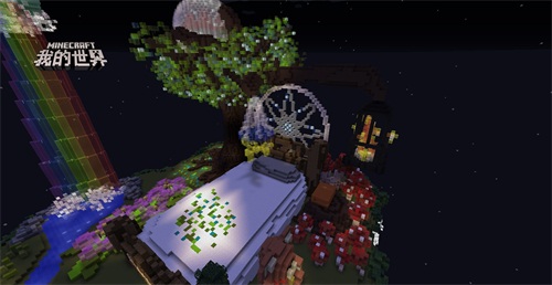 “月桂树下,木藤床前;摇曳茉莉,伴君入眠;云朵翩翩,小溪潺潺;捕梦网下,愿君安眠。”明亮的月光下,彩虹与鲜花、蘑菇融为一体,云朵撑起了整座小岛,色彩斑斓的小岛与宁静的夜晚形成鲜明对比,宛如天境。