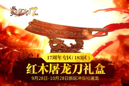 17周年专区(183新区)现已爆服开放!新区冲级活动正在火热进行中!在9月28日-10月28日零点期间,最终杀入服务器排行榜前十,并且等级达到60级,即可获赠《热血传奇》17周年顶级藏品——限量版的红木屠龙刀礼盒!