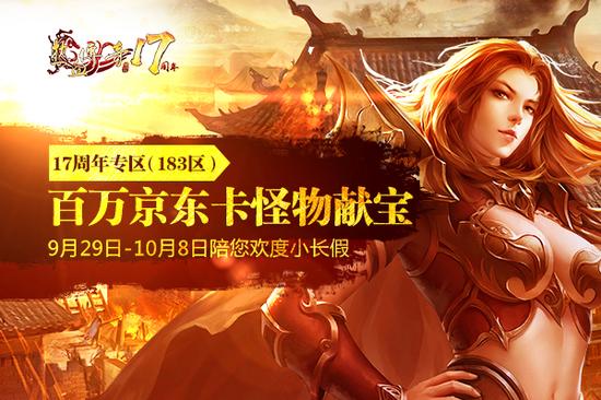《热血传奇》17周年专区(183区)现已燃爆开区!百万京东卡怪物献宝人人可抢!新区冲级抢顶级藏品“红木屠龙刀”!17年传奇,兄弟们都在,让我们相约玛法不见不散!