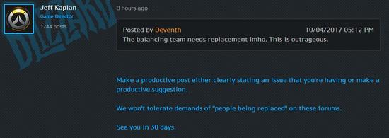 总监Jeff Kaplan看到了他的这条留言,回复了他,当然对这名玩家来说肯定不是什么喜讯:“发个有用的帖子清楚地描述你的问题,或者提出有用的建议。我们不能容忍‘要求换人’这种内容出现在论坛上,30天之后再见了。”