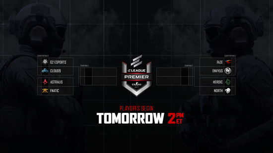 ELEAGUE Premier CS:GO 2017联赛从9月8日起正式进行,本次赛事总奖金高达100万美元,与Major特锦赛齐平,16支全球顶尖CS:GO战队齐聚美国亚特兰大一决高下。在为期一个月的小组赛之后,G2、C9、Astralis、Fnatic、FaZe、EnVyUs、Heroic、North成功出线,而SK、VP等强队被淘汰。这8支战队将从北京时间11日凌晨2:00起进行为期4天的淘汰赛比赛,14日决出最终的冠军,具体赛程如下: