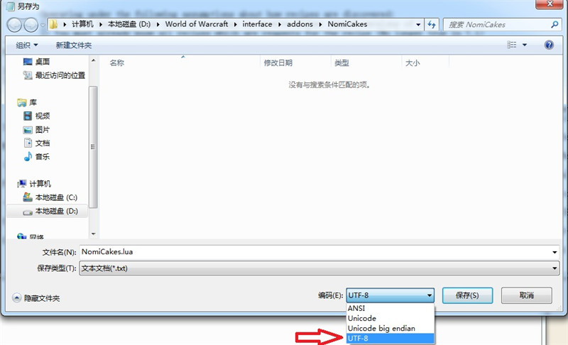 注意:这两条代码不能同时存在于一个lua文件内,因为编码不同。这条代码添加完之后,因为代码内含有中文,所以另存为的时候编码一定要选择UTF-8格式,像这样: