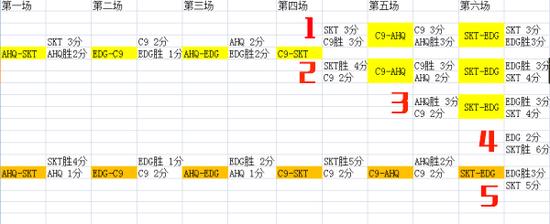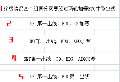 经过精密的计算,EDG现在的出线情况总共有五种。但前提是必须赢下前两场和C9、AHQ的比赛。下面就会详细说明EDG在接下来的六场比赛中EDG如何才能成功出线。(EDG不能出线的情况没有列举)