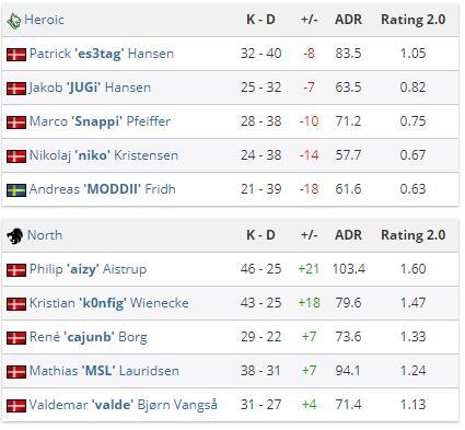 下半场换边之后,更擅长CT方防守的North取得4-0的开局,Heroic因埋下C4能够在第一个长枪局之后再次购买武器投掷物进攻,拿到他们的第7分之后Heroic没能再度得分,North轻松地以16-7取胜,总比分2-0赢下这场丹麦德比。