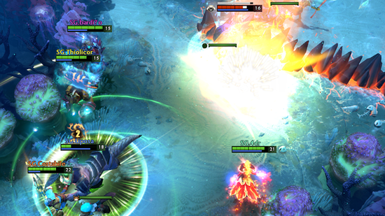 随后,VG迎来了他们的第一个大招强势期。拒绝者手握时间膨胀,带领队友挥师南下。但SG却巧妙地选择避而不战——三名英雄靠长手技能守塔,龙骑士和电狗则在上路偷偷带球。眼看正面团打不起来,VG众人纷纷搞起了点金手,节奏因此被一拖再拖。不过在这过程中,VG凭借着多个大招也抓住过几次比较有利的机会:13分钟击杀龙骑,16分钟逮到电狗,18分钟Gank牛头。但从“事后诸葛亮”的角度讲,这些击杀都没有戳到SG的痛处,何况老11也用几次阵亡顺带着把经济送了回去。