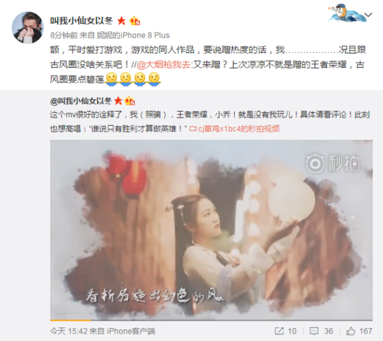 事件一出,以冬的粉丝也是迅速保护以冬,撕逼发起人也是跟以冬以及粉丝们诚挚道了歉。小编倒是觉得王者荣耀固然火热,但蹭热度就稍有点过分了。王者荣耀和古风都是一个人的爱好,兼顾王者荣耀和古风音乐又何尝不可?