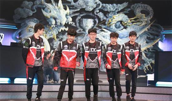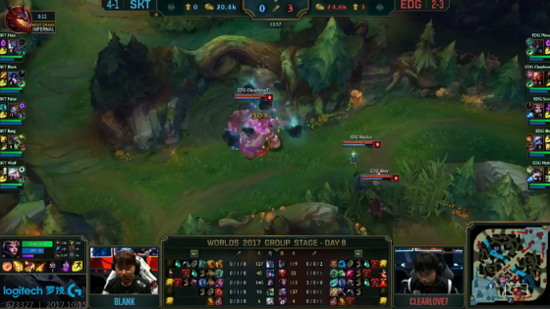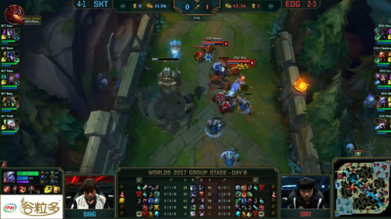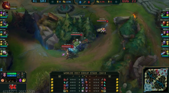 这局比赛SKT拿出了一套后期的阵容,上路巨魔、下路拿出了风女保护老鼠,中单拿出了发条。EDG则拿出了一条线上阵容,中单妖姬,下路小炮和露露。
