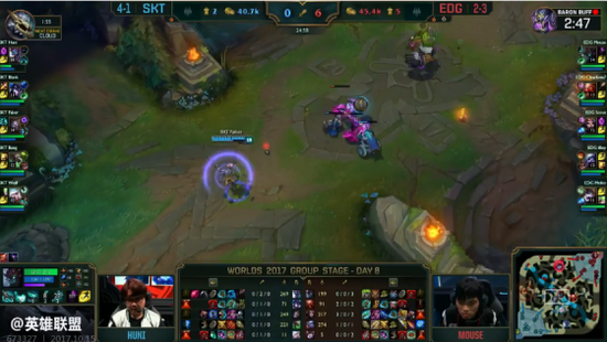 后期,EDG抓住机会秒掉风女后拿下大龙,拿到大龙的EDG经济领先了6000,EDG直接抱团拿下了下路的高地塔。眼看EDG只要稳住中路进攻就有机会拿下比赛,但是在中路进攻出线失误被SKT抓住机会被团灭丢掉大龙,SKT把经济优势追了回来。