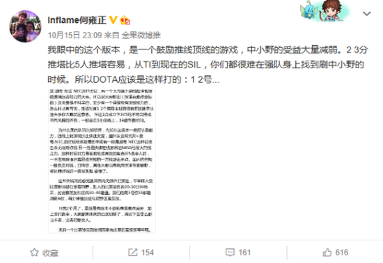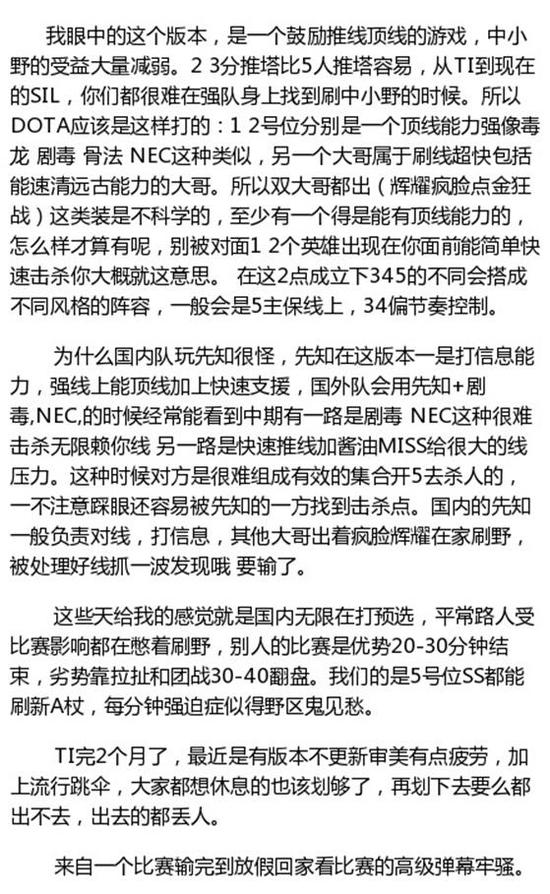 SLI国际精英邀请赛第三赛季的比赛还在激烈进行中,中国军团VG以及Newbee总共出场4个BO3,以0-8未尝一胜耻辱性的比分结束了SLI的征程。这个成绩相比是谁都不发接受的,在15日晚23点,LFY三号位剑来微博长文发表了一下自己对于当前版本的理解,以及目前中外战队的打法差距。
