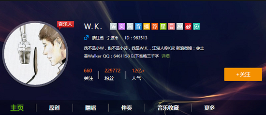 5SING是国内最大的原创音乐基地之一,在这个藏龙卧虎之地,K叔拥有着22万粉丝和12亿人气,不仅仅是因为他细腻的唱功,更吸引人的是蕴藏其中那深刻的情感释放。相信听过K叔《弱水三千》、《新霸王别姬》的人永远忘不了其中的温情与缠绵悱恻。。对此,粉丝纷纷评价说:K叔的歌走心,走心到直接钻进你耳朵里不出来了。