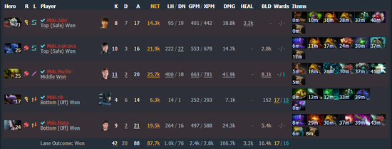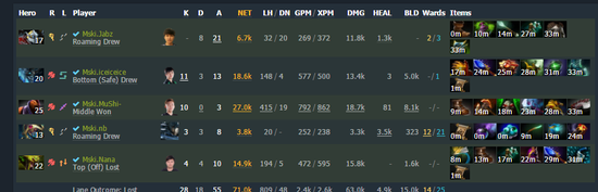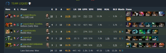 第四局打High了的液体已经完全没有把Mineski放在眼里了,miracle的劣势路敌法,Mutubaman的中单剧毒,MC的优势路龙骑,粗看还以为只会出现在2000分鱼塘的分路,最终竟然还被liquid打的有模有样,在不到20分钟的时间内,他们就犹如秋风扫落叶一般的推平了Mineski,最终轻松拿下了比赛。