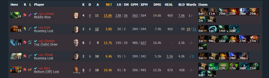 第二局拿出了一套虚空凤凰的团战体系,在这套打架要厉害的多的阵容上,NB的发挥要好看了许多,甚至在全场的大部分时间内,他们的经济都一直保持在领先的地位。但当比赛拖到后期的时候,Col的酱油冰龙发力,不同于传统冰龙出跳刀微光打救人放大套路,Zfreek直接隐刀A杖让队伍在后期多了一个输出点,最终45分钟的一波团战成为了转折点,在那之后NB队员连续被抓,最终交掉了比赛胜利。