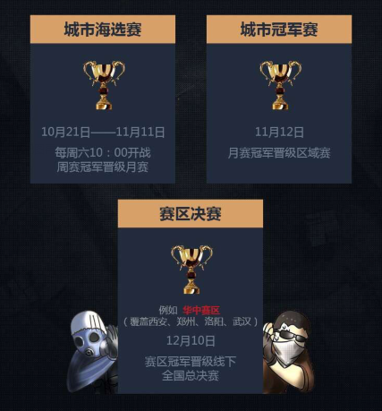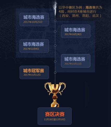 在特定网吧每周进行海选,决出周赛冠军。失败的玩家不用气馁,下一周可再次参赛,依然有机会晋级。