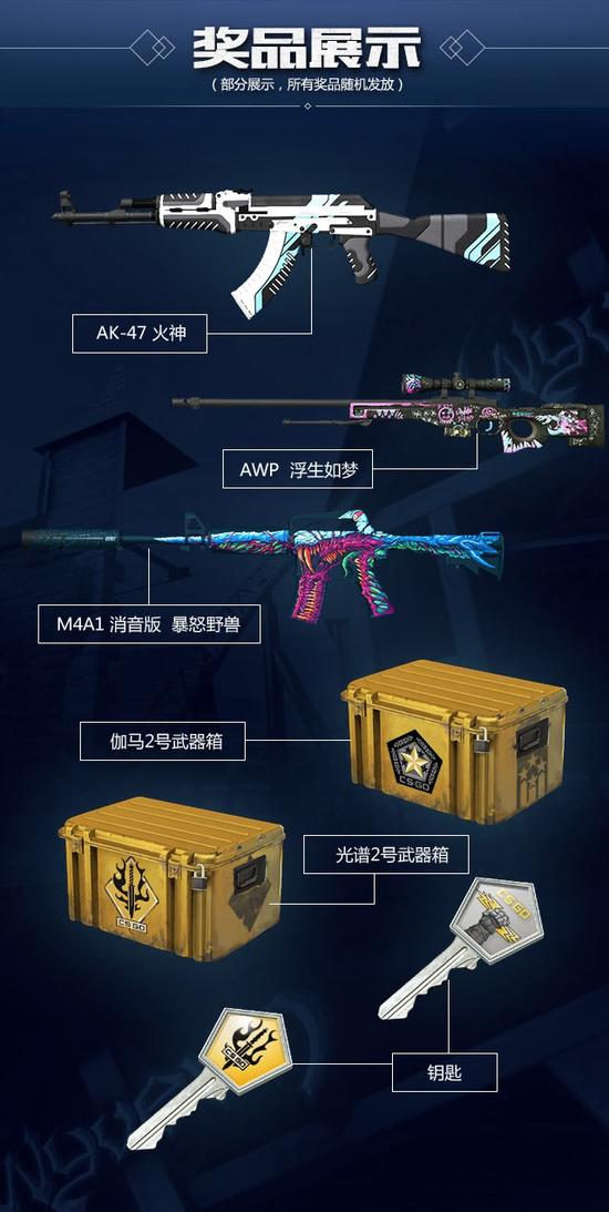 2。 参与方式:所有[回归老玩家]只要在活动期间登录CS:GO国服,均可获得回归好礼,奖品随机发放