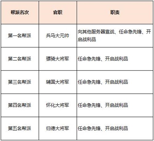 获得参战资格的服务器,每周周一0点,系统会按照各个帮派的威望进行排序,排名前五帮派帮主将被任命相应的官职,其中兵马大元帅可在规定时间内前往长安城(389,37)进行宣战。每个军团可以任命4个急先锋合计20个急先锋,急先锋可以在长安之围中参与“叫阵”。此外,非五大帮派的成员可通过NPC“记室参军”加入到府兵阵营,参与战斗。